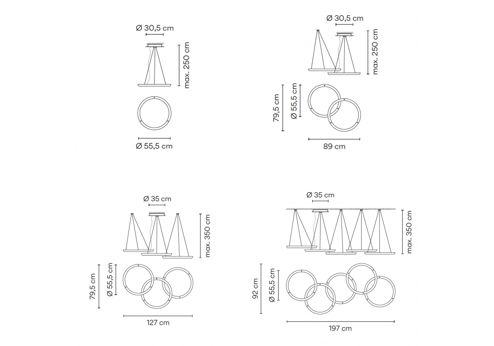 | Abmessungen | Ø 55,5 x H 250 cm; 89 x 79,5 x H 250 cm; 127 x 79,5 x H 350 cm; 197 x 92 x H 350 cm. |