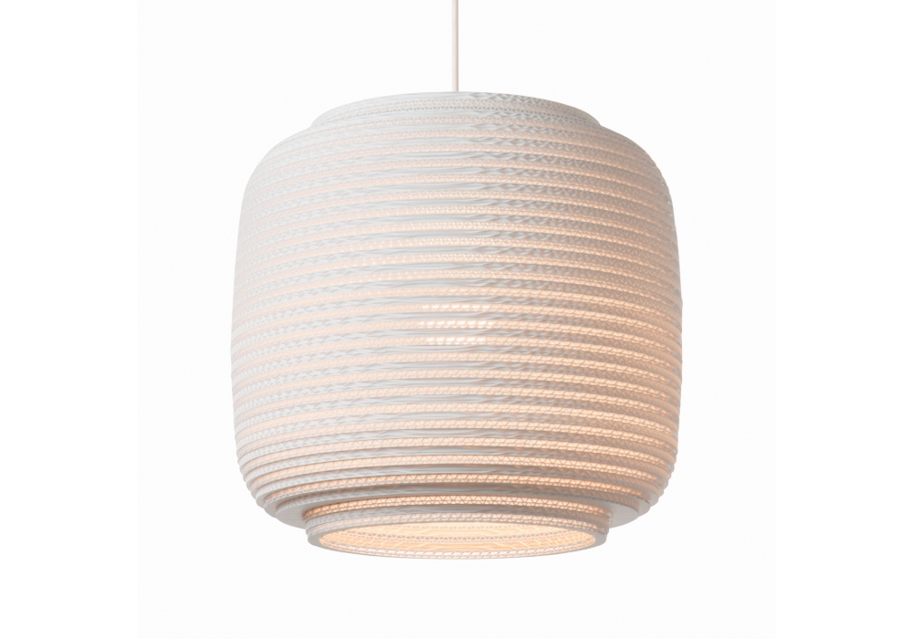 Ausi14 von Graypants ist eine Hängelampe mit Diffusor aus recyceltem Wellpappe, erhältlich in zwei Varianten (natürlich und weiß).