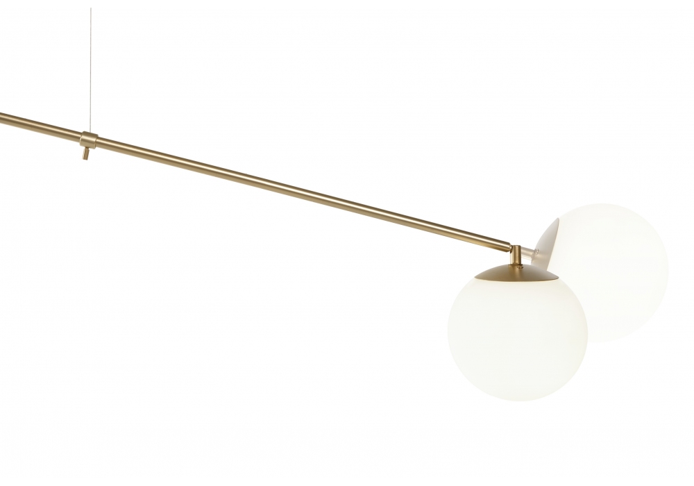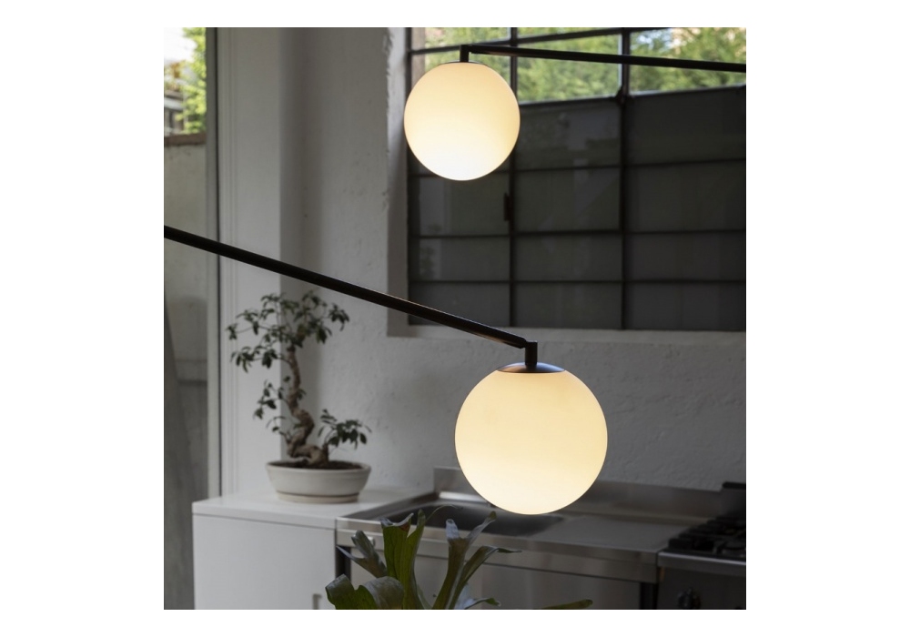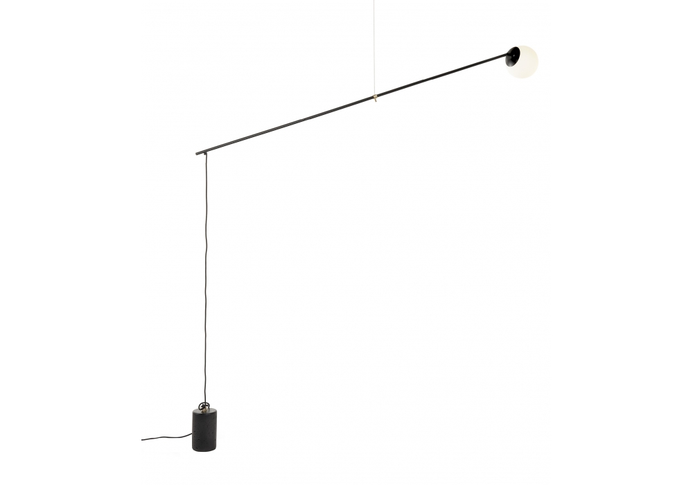 Bitta, von Sebastiano Tosi für Mogg entworfen, Hängeleuchte mit Struktur aus lackiertem Metall in verschiedenen Ausführungen. Verstellbare Kugel aus Opalglas Durchm. 20 cm, Gewicht auf dem Boden zur Positionierung und Höhenverstellung in schwarzem Zement.