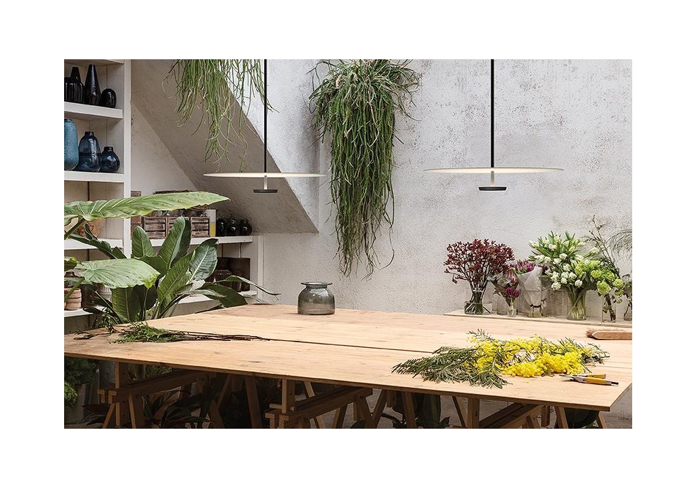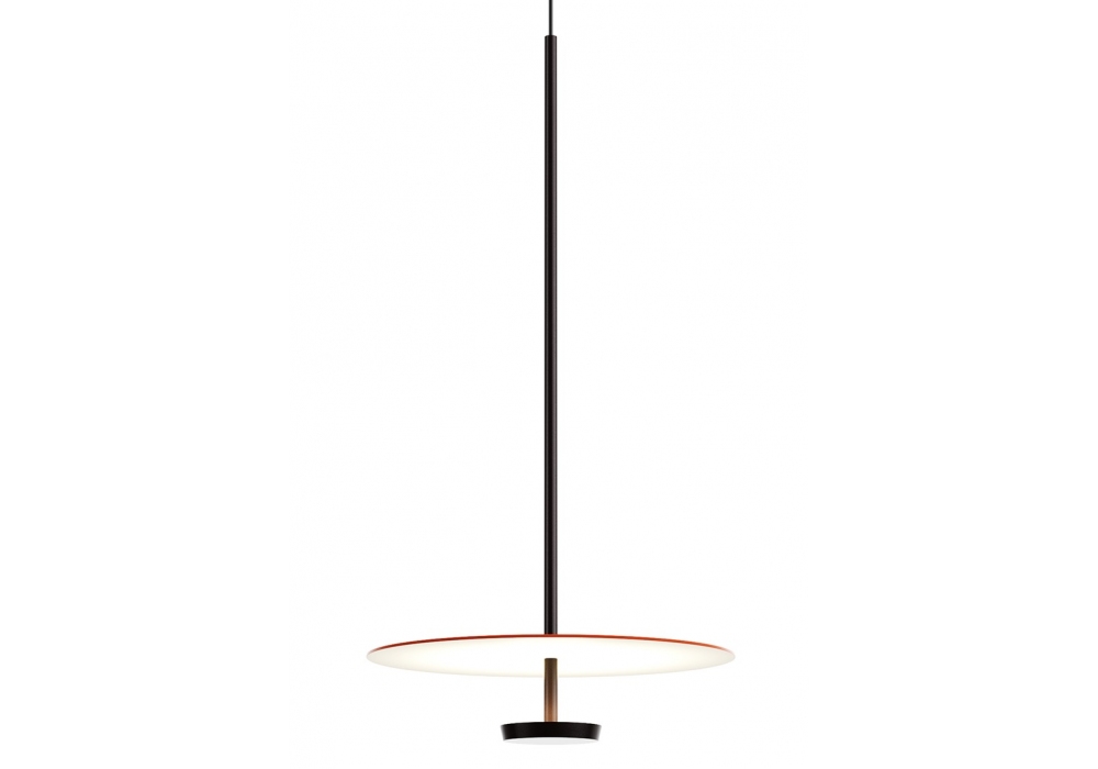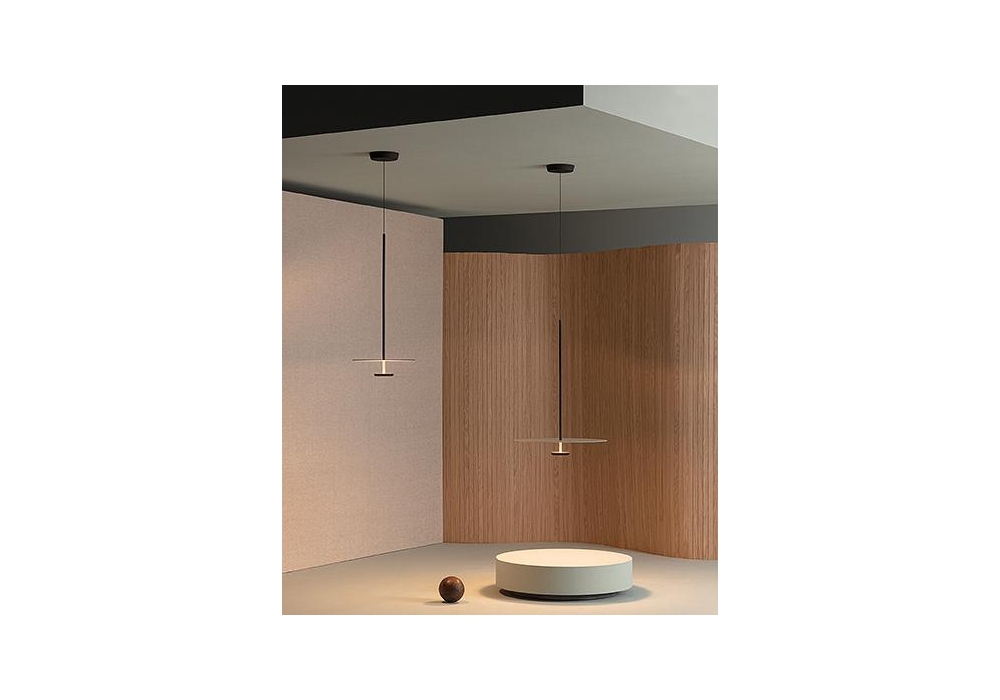 Flat von Ichiro Iwasaki für Vibia entworfen ist eine Hängeleuchte mit Aluminiumrosette und röhrenförmiger Struktur aus lackiertem Stahl. Der Scheibendiffusor besteht aus Polycarbonat mit einem Lampenschirm aus Aluminium und verfügt über eine LED-Lichtquelle. Flat ist in verschiedenen Modellen, Ausführungen, Abstufungen der Lichtquelle und Dimmbarkeit erhältlich.