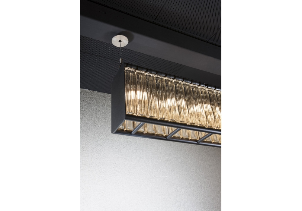 Linea Estadio von Miguel Milá für Santa & Cole entworfen, ist eine Hängeleuchte mit schwarzem Metallgestell, Glasblockschirm, Aufhängesystem aus Edelstahl, Deckenrosette aus satiniertem Nickel inklusive.