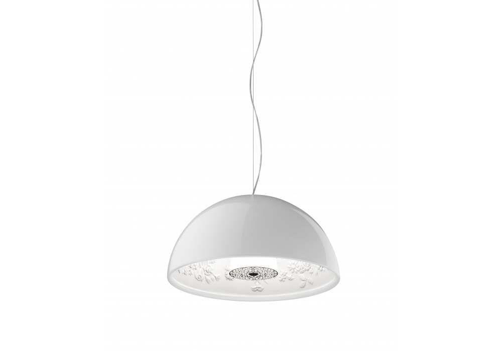 Skygarden Small von Marcel Wanders für Flos entworfen, ist eine Hängeleuchte mit diffusem Licht. Innen eine weiße Gipskuppel. Kuppelhalterung aus Aluminiumlegierung. Diffusor aus geblasenem Opalglas. Fries aus fotograviertem und gezogenem Edelstahl. Deckenrosette aus PC in der Farbe der Kuppel. Fernverstellbar (Dimmer nicht enthalten). LED-Lichtquelle enthalten.