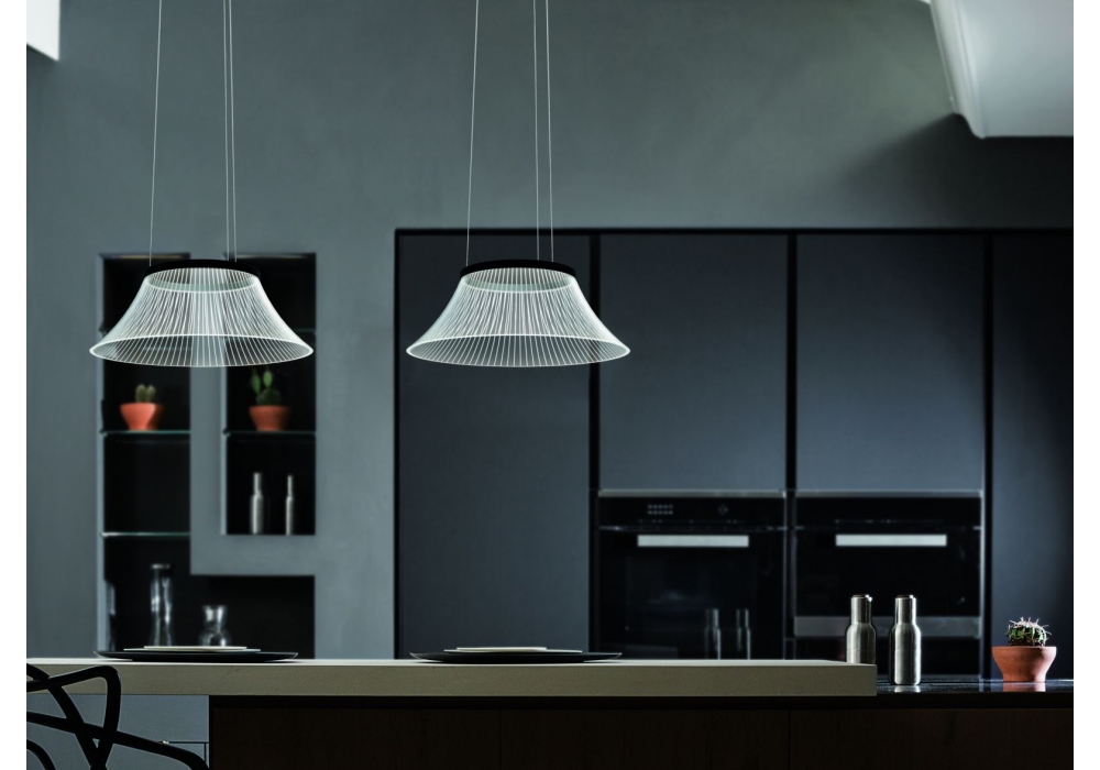 Plissè von Emiliana Martinelli für Martinelli Luce entworfen, ist eine Hängelampe in runder Form mit tragender Struktur aus lackiertem Aluminium. Der Diffusor besteht aus transparentem Methacrylat und zeichnet sich durch lasergefertigte grafische Zeichen aus. Die verwendete Lichtquelle ist vom integrierten LED-Typ.
