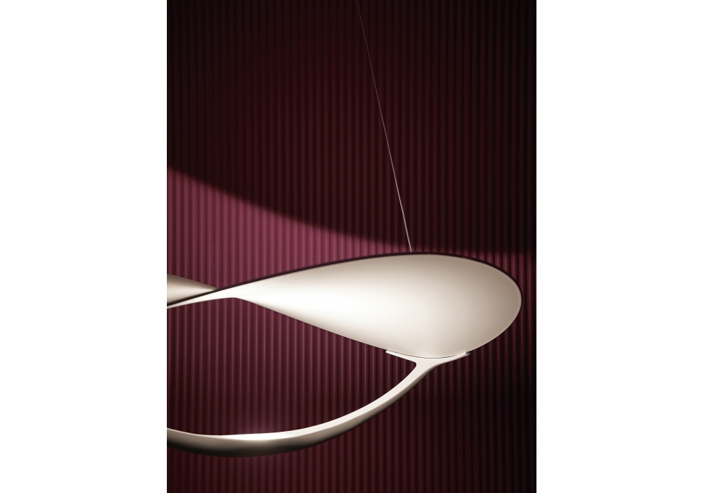 Plena von Eugenio Gargioni und Guillaume Albouy für Foscarini entworfen, ist eine Hängeleuchte, die durch die Kombination von weiß lackiertem PVC und Aluminium strukturiert ist. Die gewählte Lichtquelle ist vom Typ LED in verschiedenen dimmbaren Versionen.