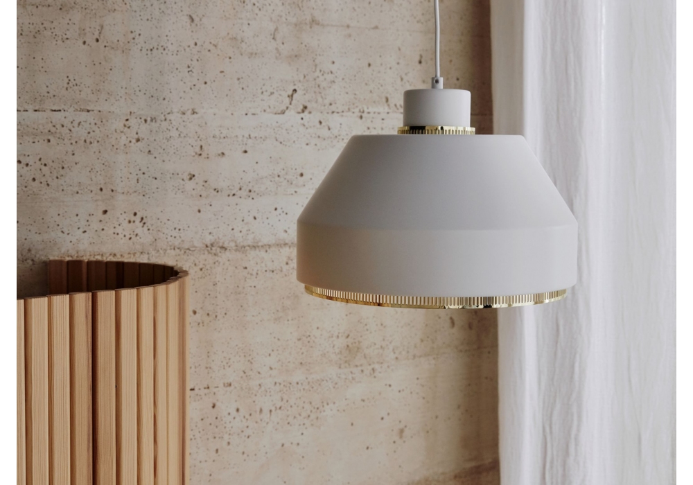 AMA500 von Aino Aalto für Artek entworfen, ist eine Hängeleuchte aus weiß pulverbeschichtetem Schirm und messingbeschichtetem Ring. Weißes Kunststoffkabel
