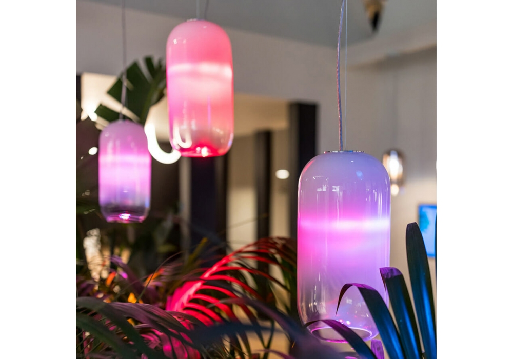 Gople RWB Lamp entworfen von BIG - Bjarke Ingels Group für Artemide ist eine Hängeleuchte mit zylindrischem Diffusor aus mundgeblasenem Glas und Aluminiumhalterung. Die verwendete Lichtquelle ist vom Typ LED mit verschiedenen Arten von Dimmbarkeitssystemen.