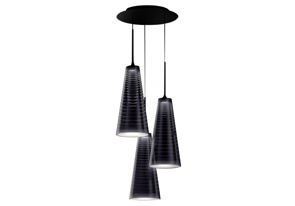 Look at Me Cluster entworfen von Alida Catella und Silvio De Ponte für Artemide ist eine Hängeleuchte mit mehreren Diffusoren und einer Struktur aus schwarz lackiertem Metall. Es gibt drei rauchschwarze konische Lampenschirme mit einer LED-Lichtquelle mit einem Push-App-Dimmsystem, das ferngesteuert werden kann. Look at Me Cluster ist in verschiedenen Größen erhältlich.