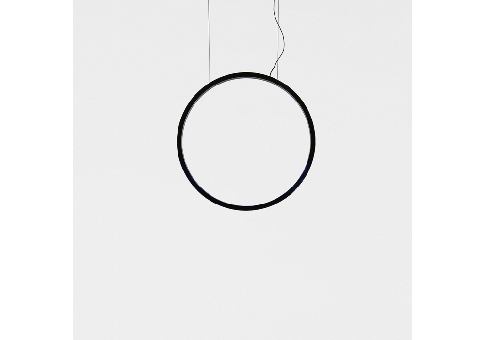 "O" von Elemental für Artemide entworfen ist eine Hängeleuchte mit schwarz lackierter Aluminiumstruktur und Silikondiffusor. Die verwendete Lichtquelle ist vom Typ LED. "O" ist in verschiedenen Größen erhältlich.