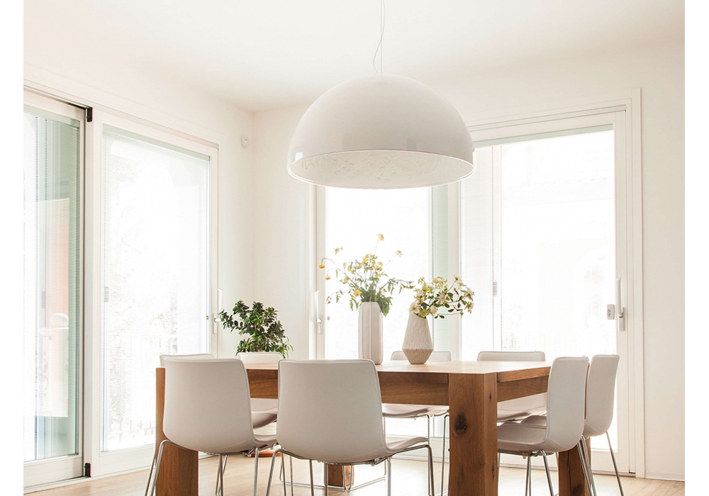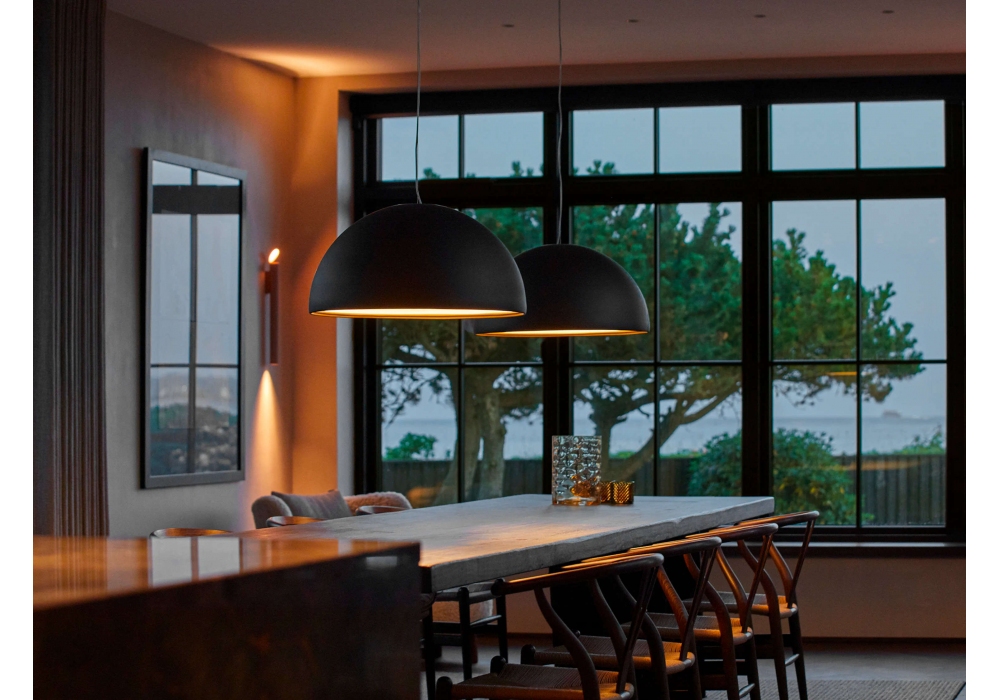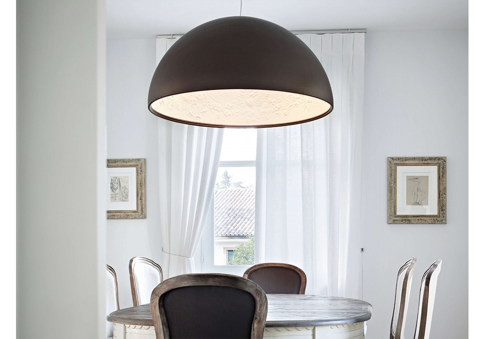 Skygarden 1 von Marcel Wanders für Flos entworfen, ist eine Hängeleuchte mit diffusem Licht. Innen eine weiße Gipskuppel. Kuppelhalterung aus Aluminiumlegierung. Diffusor aus geblasenem Opalglas. Fries aus fotograviertem und gezogenem Edelstahl. Deckenrosette aus PC in der Farbe der Kuppel. Fernverstellbar (Dimmer nicht enthalten). LED-Lichtquelle nicht enthalten.