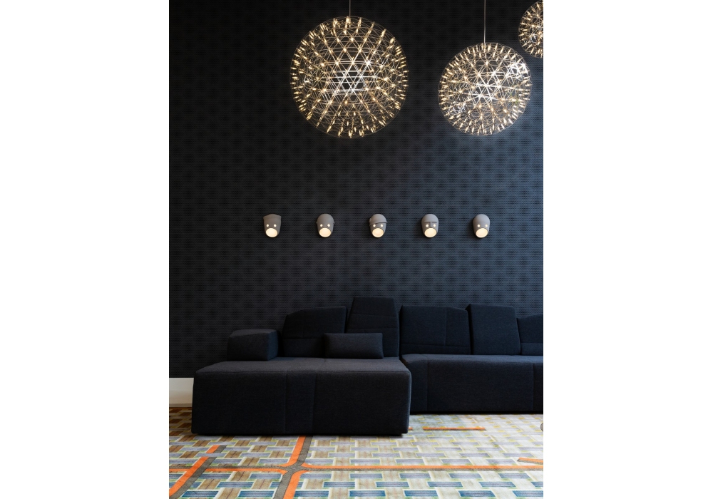 Raimond II R127-R163-R199 von Raimond Puts für Moooi entworfen, ist eine dimmbare Pendelleuchte aus Edelstahlkugel mit PMMA-Linsen. Erhältlich in drei Größen: ø 127 cm mit 492 Leds, ø 163 cm mit 812 Leds und ø 199 cm mit 1212 cm. Transparentes Kabel. Rechteckige Deckenrosette aus weißem Metall.