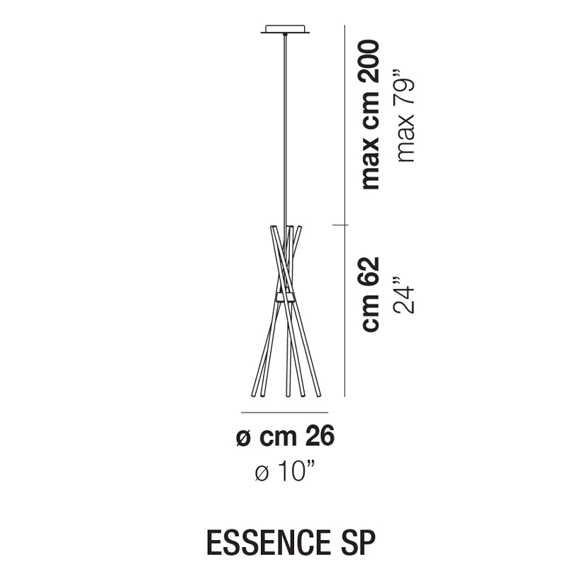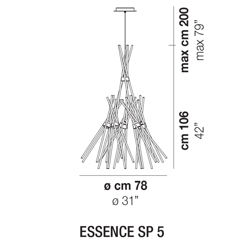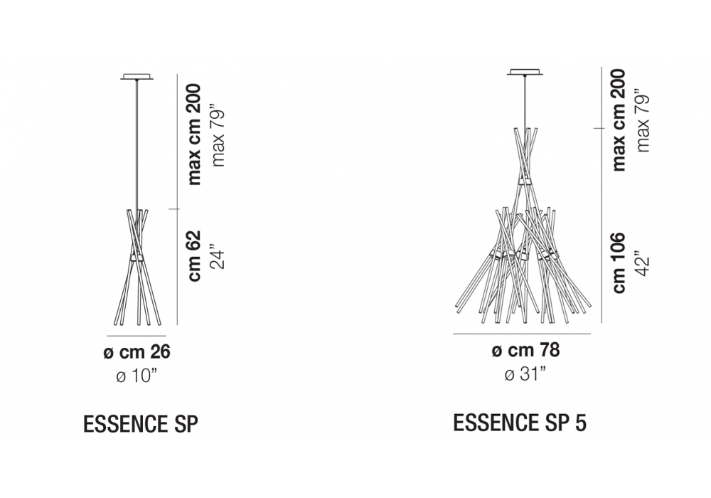 Essence von atelier oï für Vistosi entworfen ist eine Hängeleuchte mit tragender Struktur aus bronziertem aluminiumfarbenem Metall. Die Diffusoren bestehen aus verschiedenen röhrenförmigen Stäben aus schattiertem Kristall mit einer dimmbaren LED-Lichtquelle in verschiedenen Lichtschattierungen. Essence ist in zwei verschiedenen Versionen erhältlich.