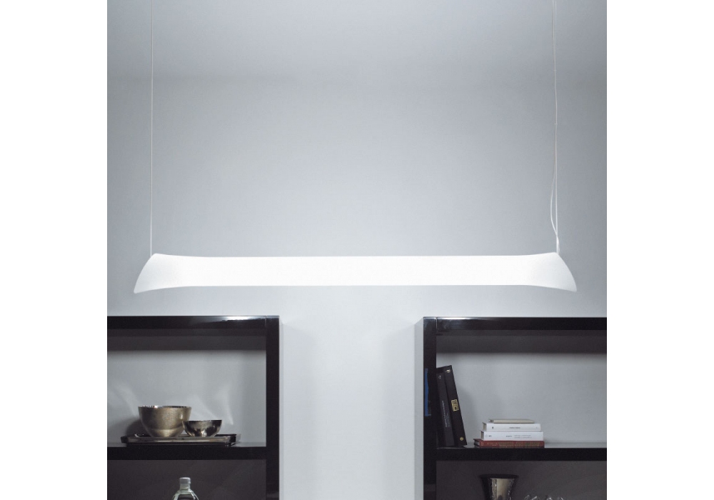 Lepanto, von Luciano Vistosi für Vistosi entworfen, ist eine Hängeleuchte mit tragender Struktur und Aufhängekabeln aus Metall in Nickeloptik. Der Diffusor besteht aus Glas mit ausgestellter Rohrform in der Farbe Weiß/Pulegoso und nimmt eine LED-Lichtquelle mit G5-Anschluss auf.