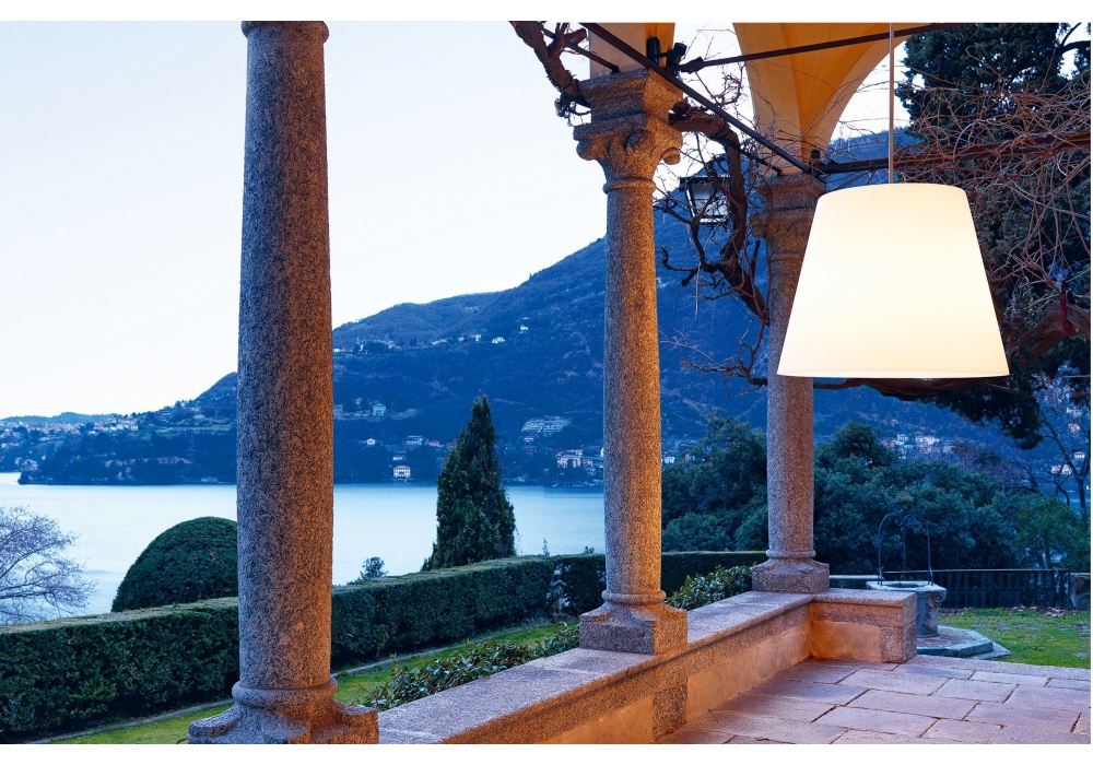 Amax von Charles Williams für Fontana Arte entworfen, ist eine Hängeleuchte, die dimmbares, diffuses Licht mit verchromtem Metallrahmen und weißem Polyethylen-Diffusor gibt. Das Aufhängungskabel ist aus Stahl, während das Stromkabel aus rotem Stoff besteht. Verfügbar in verschiedenen Abmessungen.