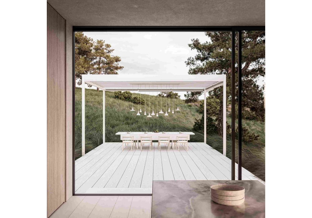Shadows Exterior, von Lucie Koldová und Dan Yeffet für Brokis entworfen, ist eine Hängeleuchte für den Außenbereich mit einem Diffusor aus mundgeblasenem Glas mit polierter oder säuregeätzter Oberfläche und einer dimmbaren LED-Lichtquelle. Die Metallrosette ist in der Farbe des Leuchtenhalses gehalten.