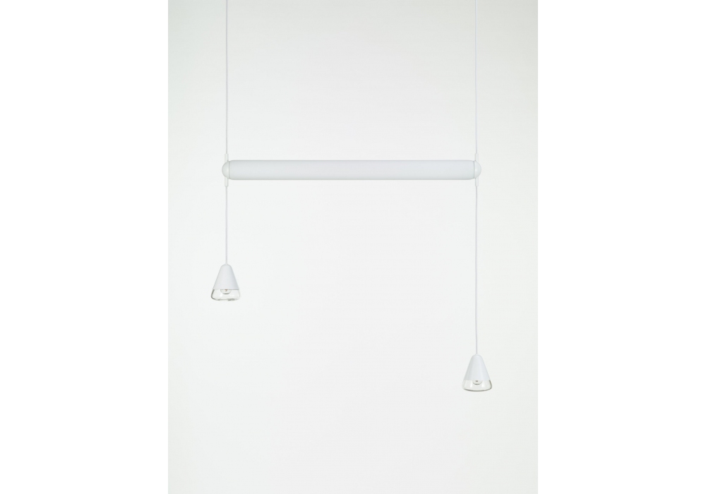 Puro Single Horizontal von Lucie Koldova für Brokis entworfen, ist eine Hängeleuchte mit zylindrischer Tragstruktur aus Glas und pulverbeschichtetem Metall. Der Diffusor besteht aus Metalldruckguss und verfügt über eine dimmbare LED-Lichtquelle in verschiedenen Ausführungen. Der Lampenschirm besteht aus mundgeblasenem Glas mit säuregeätzter Oberfläche (matt). Im unteren Teil befindet sich eine zusätzliche Strahlerlichtquelle.