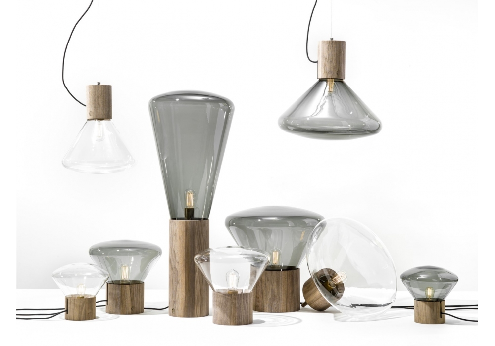 Muffins Wood 07 von Dan Yeffet und Lucie Koldová für Brokis entworfen, ist eine Hängeleuchte mit Schirm aus schattiertem Glas in verschiedenen Farben. Die tragende Struktur ist zylindrisch in Eiche oder Nussbaum und wird in verschiedenen Ausführungen behandelt oder lackiert. Die gewählte Lichtquelle ist vom dimmbaren LED-Typ.