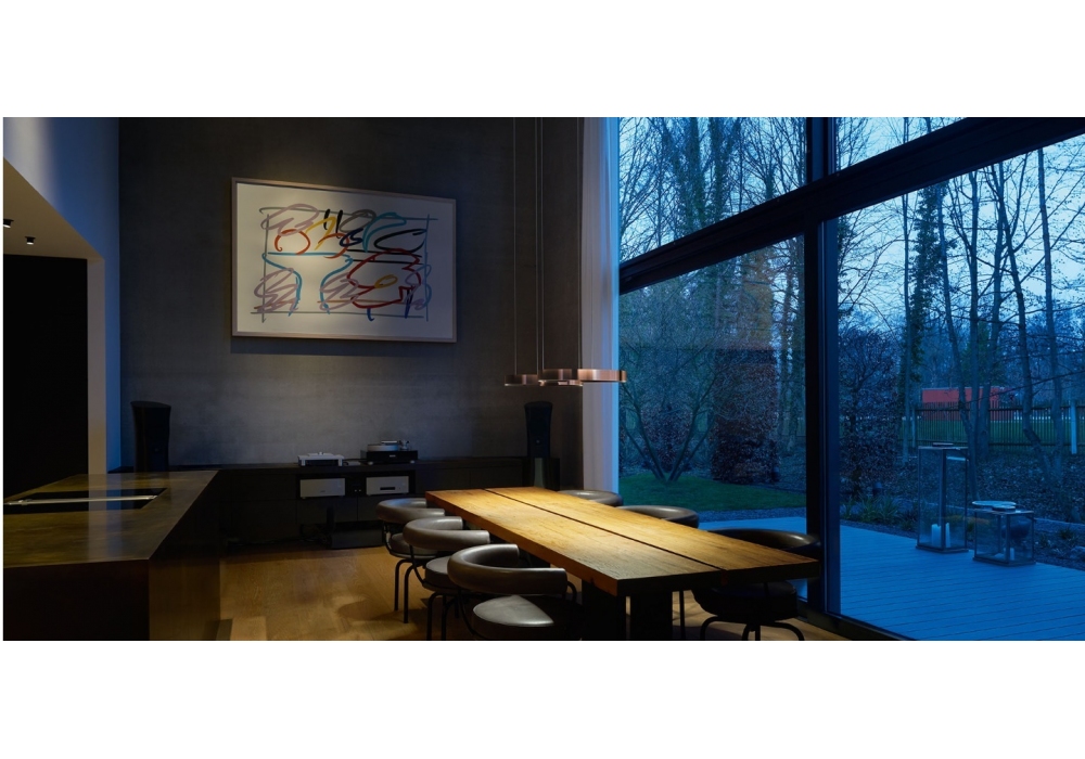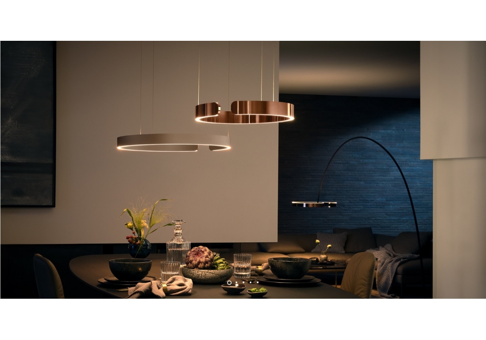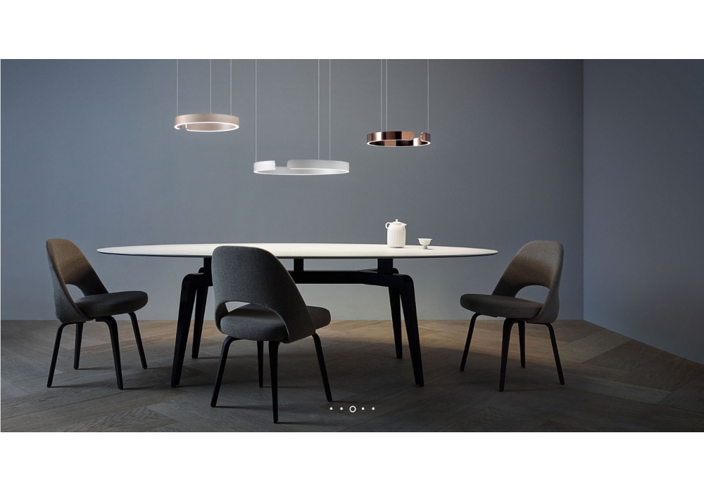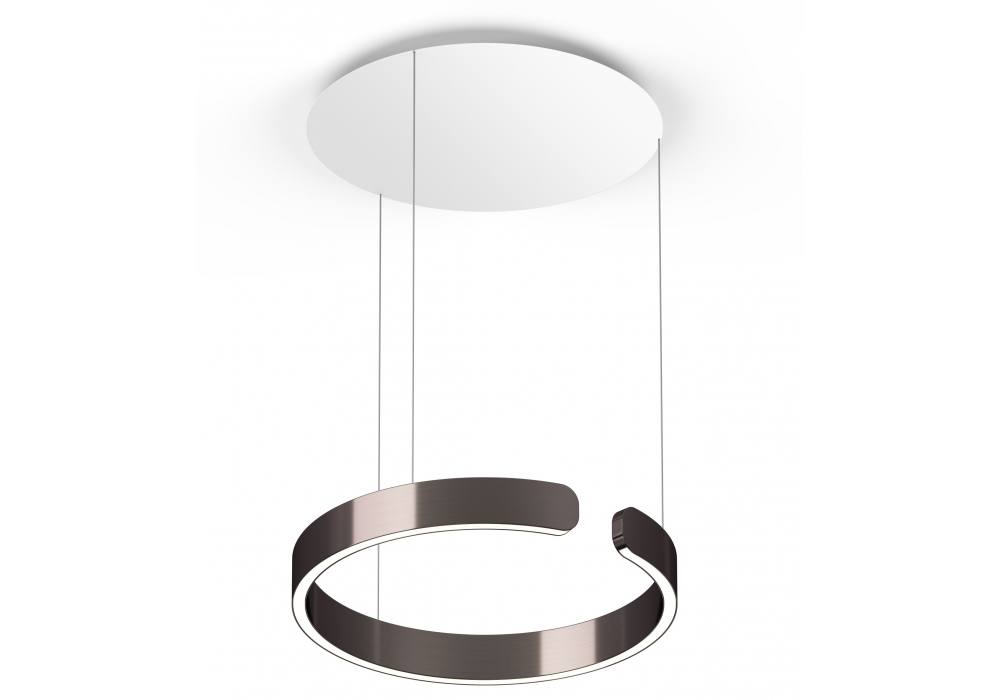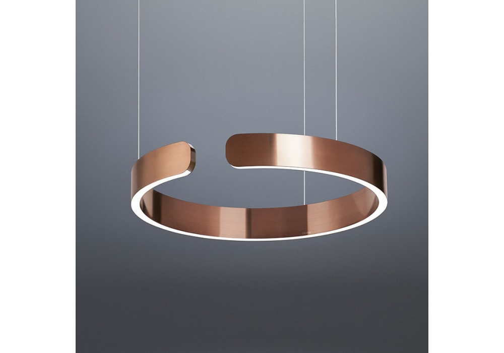 Mito Sospeso 40 von Occhio entworfen, ist eine höhenverstellbare LED-Hängeleuchte, durch das revolutionäre Gestenmanagementsystem "touchless control" ist es möglich, die Lichtfarbe kontinuierlich zu kalibrieren. Es besteht aus Aluminium, lackiertem Stahl, PVD-Beschichtung, Kunststoff, optischem Silikon und Glasfaser.