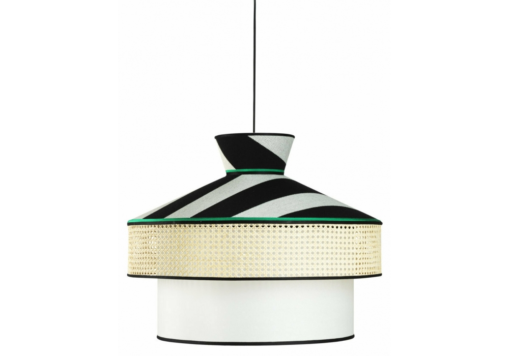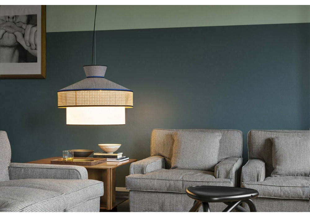 Wagasa von Gebrüder Thonet Vienna entworfen, ist eine Pendelleuchte mit Stoffschirm, erhältlich in verschiedenen Ausführungen. Lichtdiffusor aus Pergament. Wiener Stroheinlagen.