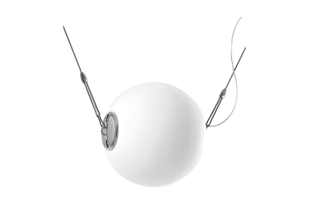Perla von Ettore Cimini und Walter Monici für Lumina entworfen, ist eine Hängeleuchte mit rundem Baldachin und Aufhängungskabeln aus Metall. Der Diffusor ist kugelförmig aus weißem mundgeblasenem Glas mit zwei Aluminiumbolzen an den Seiten zur Befestigung der Aufhängungskabel. Die eingesetzte Lichtquelle ist vom Halogentyp. Perla ist in zwei verschiedenen Modellen erhältlich.