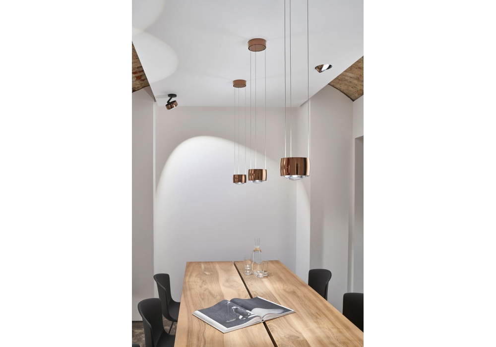 Sento Sospeso von Occhio entworfen, ist eine höhenverstellbare oder feststehende LED-Hängeleuchte aus Aluminium, Kunststoff, Glas und optischem Kunststoff mit flachem Sockel zur Montage auf einer Unterputzdose, hohem Sockel mit mitgeliefertem Netzteil oder mit eingelassener Gipsplatte eine Zwischendecke. Dimmbar über „touchless control“ oder über Occhio air. Verfügbar in mehreren Ausführungen und Modellen.