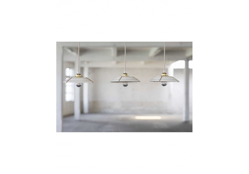 Switch Lamp von Klijn & Klijn für Serax entworfen, ist eine Pendelleuchte, mit Aufhängekabel aus Textilmaterial, tragende Struktur aus Messing und Diffusor aus weißem Feinsteinzeug. Als Lichtquelle wird LED oder Halogen (nicht im Lieferumfang enthalten) mit E27-Kupplung verwendet.
