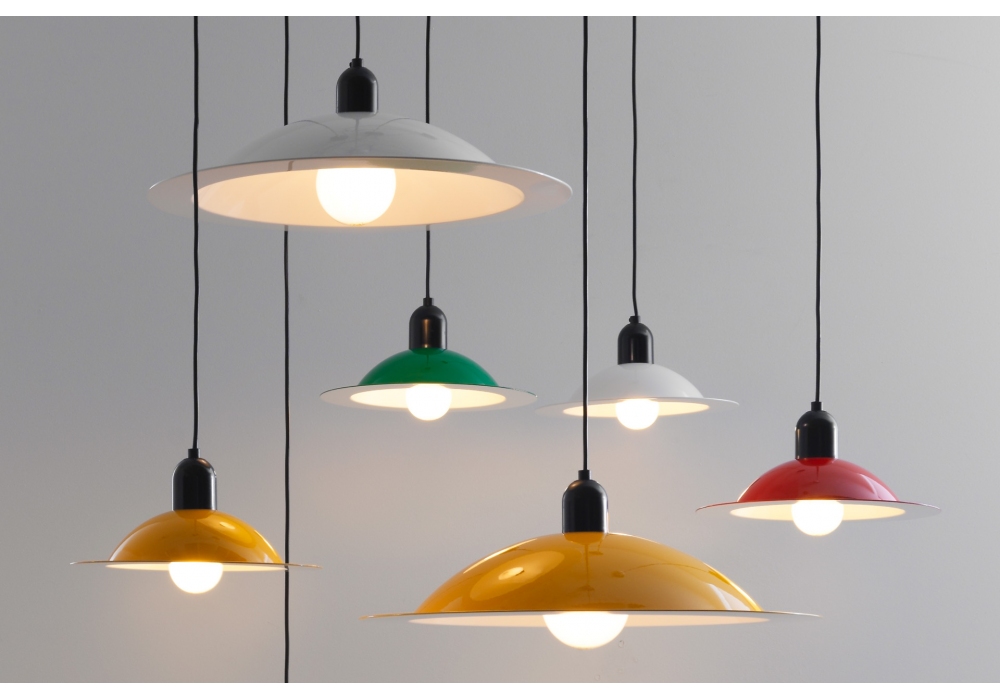 Lampiatta entworfen von Jonathan De Pas, Donato D’Urbino Paolo Lomazzi für Stilnovo, ist eine LED Hängeleuchte, die vollständig aus lackiertem Aluminium in fünf verschiedenen Ausführungen besteht: gelb-weiß, grün-weiß, weiß, schwarz-weiß und rot-weiß. Der Diffusor hat eine runde Form, die von einem weißen oder schwarzen Metallkabel getragen wird.