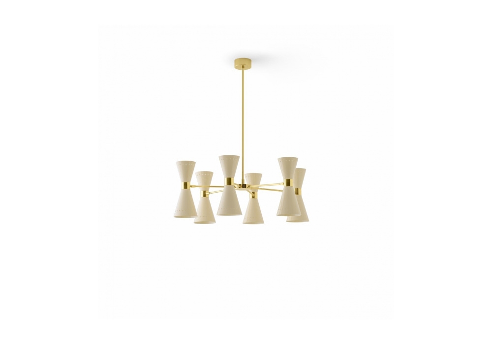 Megafono entworfen und hergestellt von Stilnovo ist eine Hängeleuchte mit einem goldfarbenen Körper aus galvanisiertem Messing in zwei Ausführungen: Gold-Schwarz und Gold-Elfenbein. Der Diffusor ist konisch aus Metall und nimmt eine LED-Lichtquelle mit doppelter Emission auf. Megafono ist in drei verschiedenen Größen erhältlich.