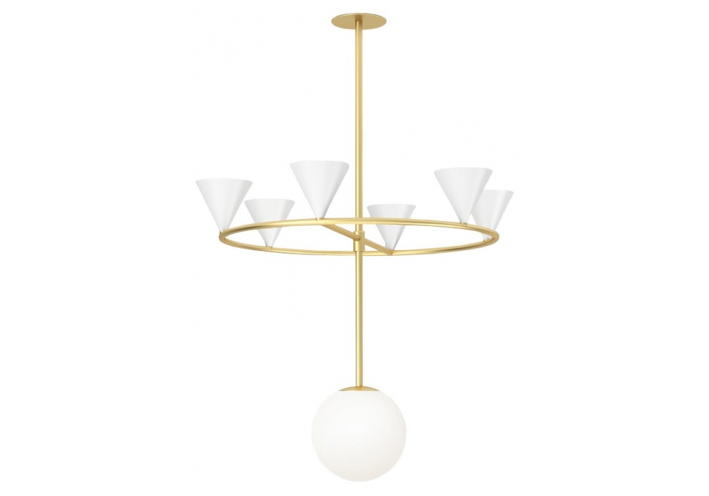 Cones On A Ring von Atelier Areti entworfen ist eine Hängeleuchte aus lackiertem Metall oder gebürstetem Messing und weißen Glaskegeln.