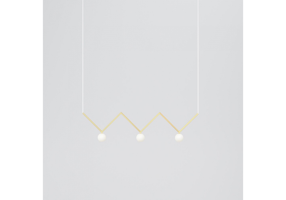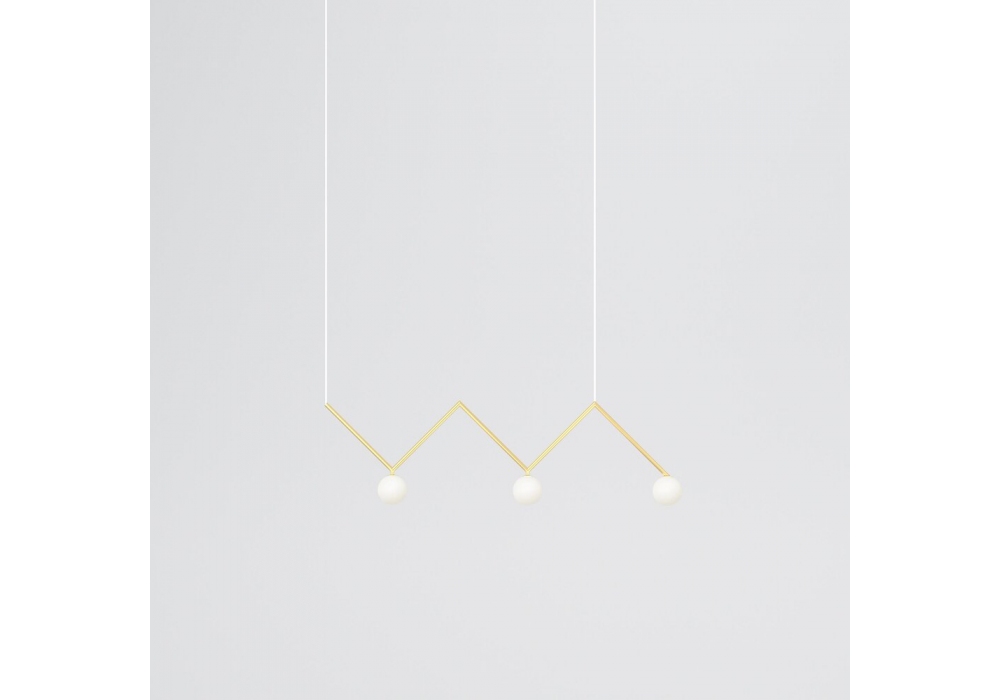 Zigzag von Atelier Areti entworfen, ist eine Pendelleuchte aus gebürstetem Messing und weißen Glaskugeln. Erhältlich in verschiedenen Modellen.