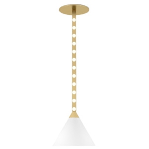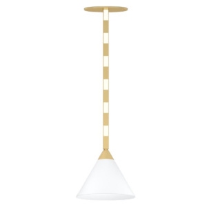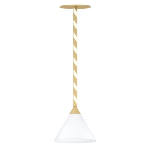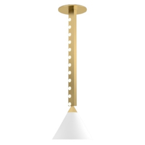 Linetype Cone von Atelier Areti entworfen, ist eine Hängeleuchte aus gebürstetem Messing, weißen Acrylplatten und weißem Glaskegel. Erhältlich in verschiedenen Modellen.