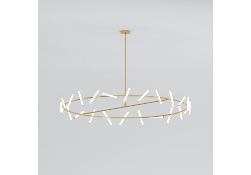 Sticks Round von Atelier Areti entworfen, ist ein Hängeleuchter aus gebürstetem Messing, schwarz oder Nickel lackiert. Lichtröhren aus weißem Acryl.