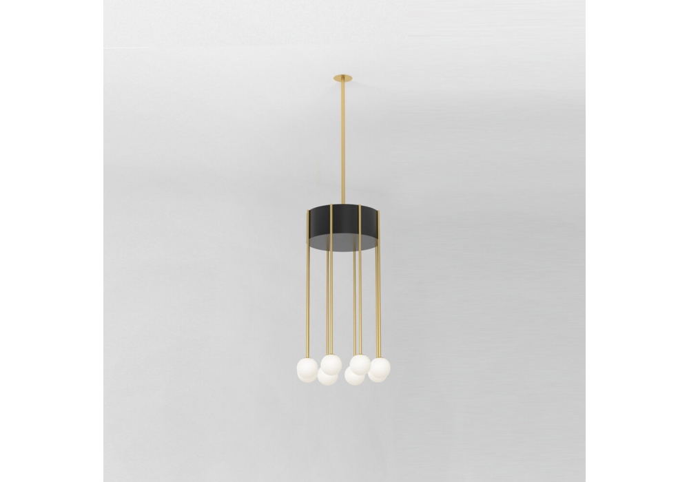 Rain of Globes von Atelier Areti entworfen, ist eine Pendelleuchte aus gebürstetem Messing und schwarz lackiertem Metall und weißen Glaskugeln.