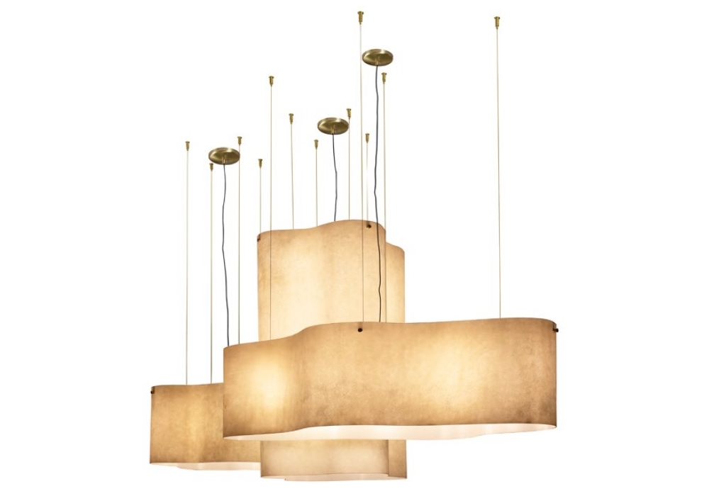 Nuvola von Draga & Auriel für Baxter entworfen, ist eine Hängeleuchte mit Lampenschirm aus Fiberglas. Rahmen und Details aus mattmessingbeschichtetem Metall mit mattem Lack. Lampe mit LED-Lichtquelle. Verfügbar in 4 Modellen.