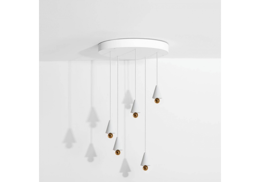 Cherry Round von Daniel - Emma für Petite Friture entworfen, ist ein Lichtsystem bestehend aus einer weißen runden Platte und 5 Cherry Mini-Pendelleuchten. Letztere ist höhenverstellbar. Erhältlich in verschiedenen Ausführungen