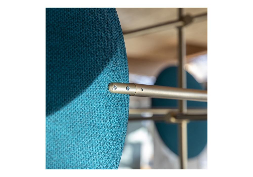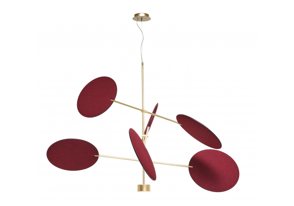 Diva, von Sebastiano Tosi für Mogg entworfen, ist eine Hängeleuchte mit Metallstruktur und verstellbaren Scheibenhalterungsarmen. Verstellbare Scheiben mit schallabsorbierenden Eigenschaften, die mit Stoff bezogen sind. Verfügbar in mehreren Ausführungen und Abmessungen.