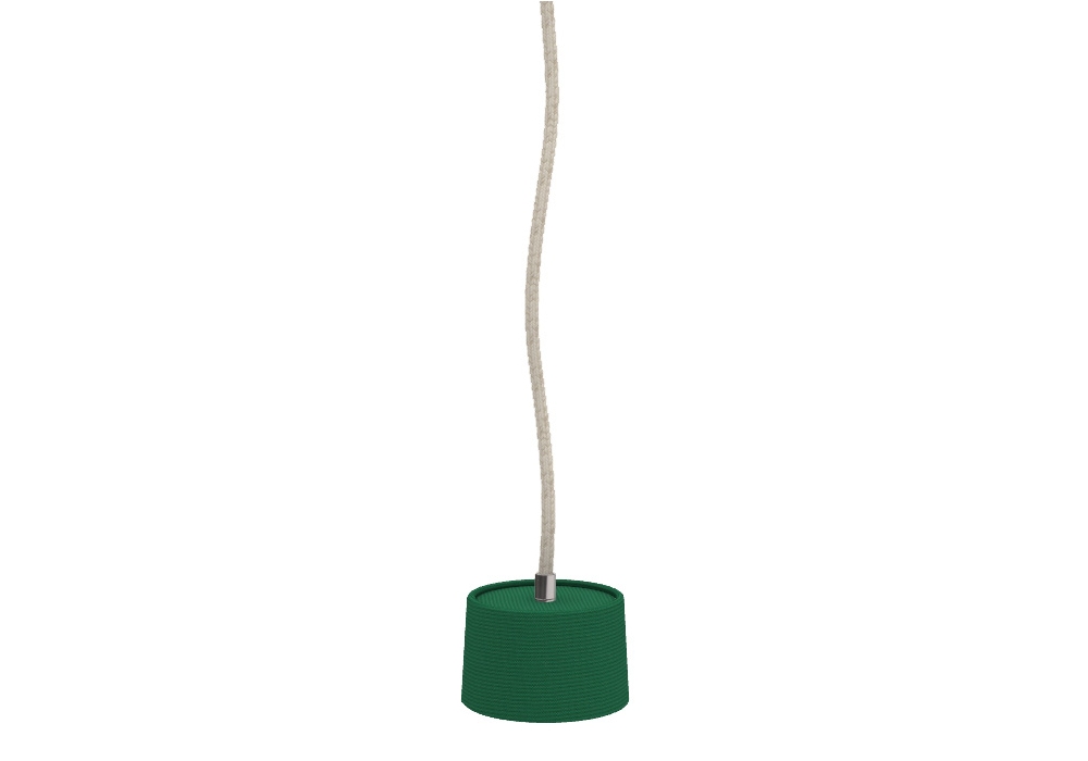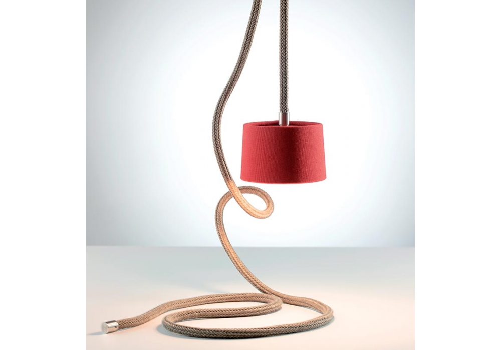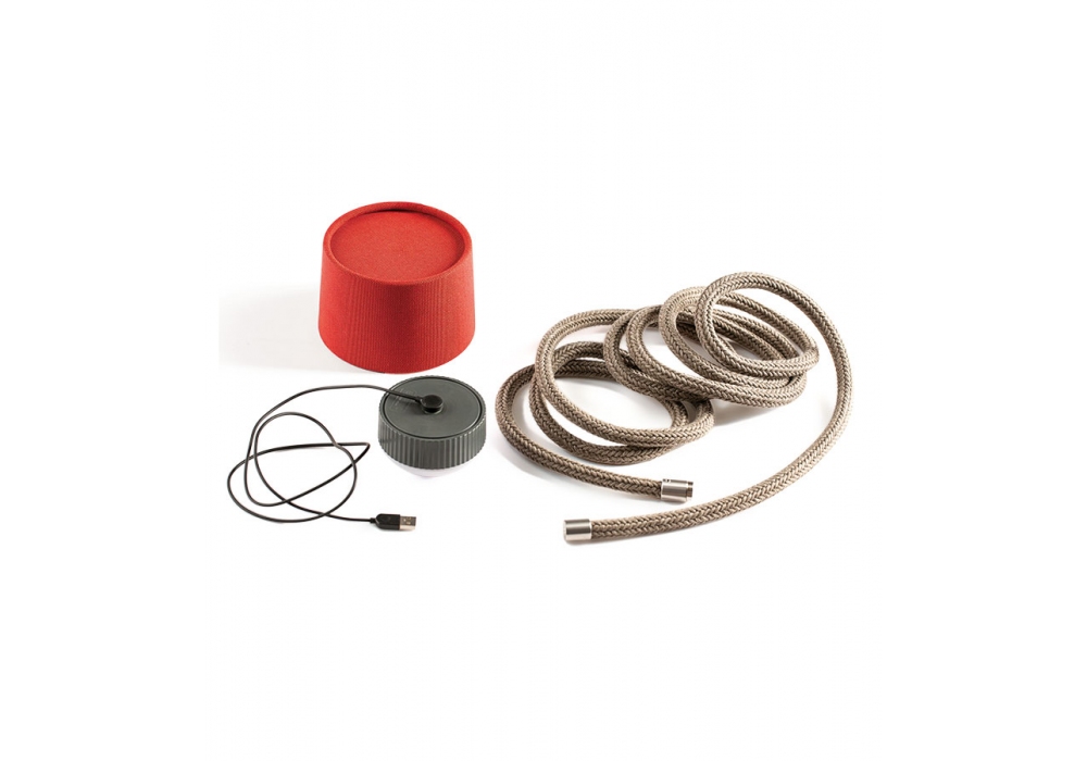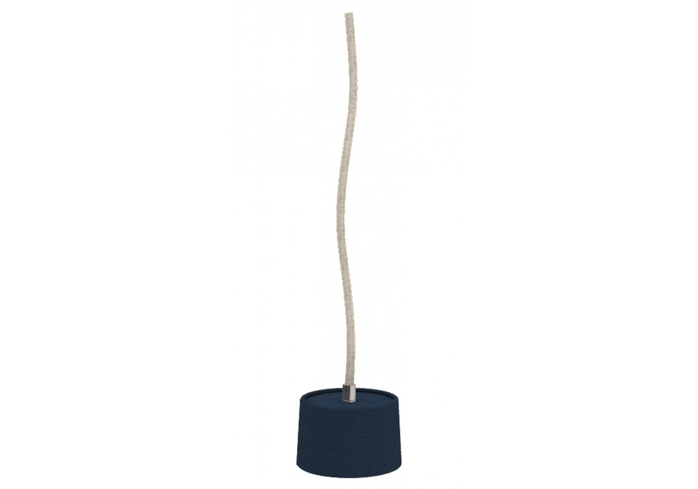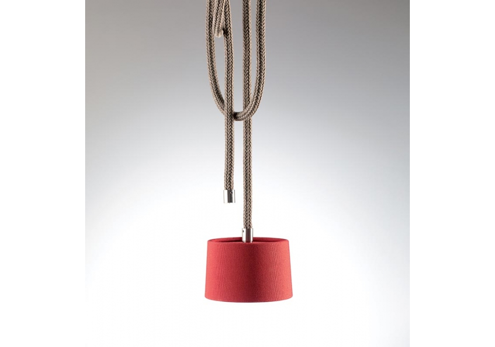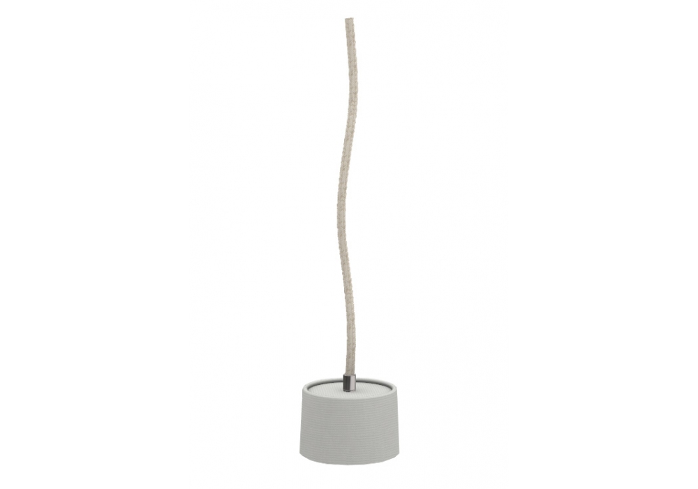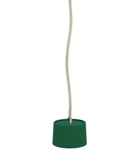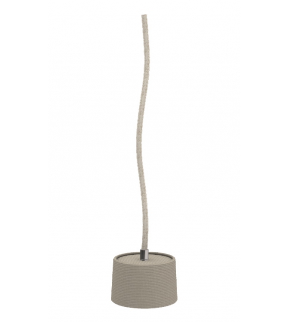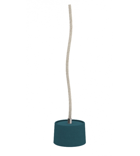 Gaia, von Marc Sadler für Ethimo entworfen, ist eine wiederaufladbare Pendelleuchte, die von einem natürlichen Seil getragen wird, das mit einem Magneten ausgestattet ist. Der Lampenschirm hat eine kreisförmige Form, die aus Polyestergewebe in verschiedenen Farben strukturiert ist.