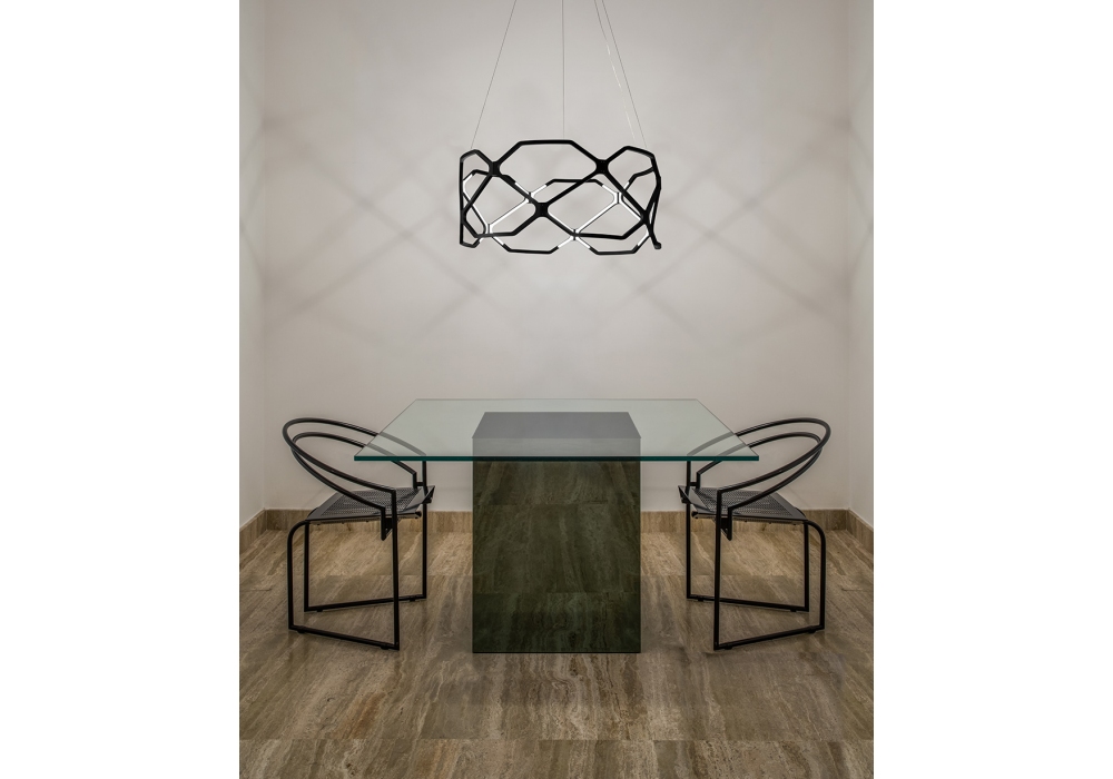 Titia Minor, von Arihiro Miyake für Nemo entworfen, ist eine Hängeleuchte in zylindrischer Form mit Rautenperforationen aus mattschwarz lackiertem thermoplastischem Material. Die verwendete Lichtquelle ist vom dimmbaren LED-Typ.