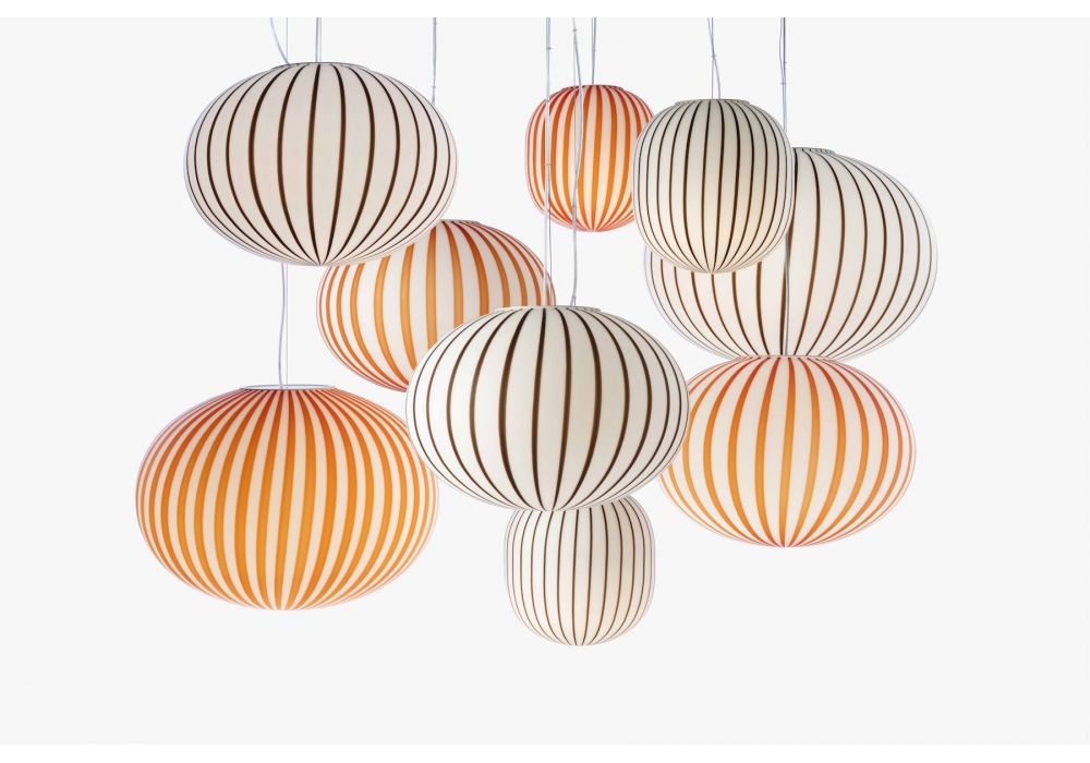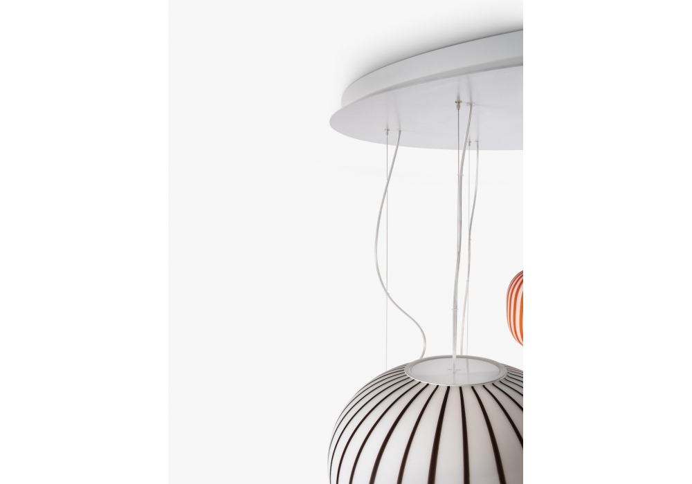 Filigrana Light Cluster, von Sebastian Wrong für Established & Sons entworfen, ist eine Pendelleuchte aus mundgeblasenem Glas und Opalkeramik mit poliertem Edelstahlreflektor, pulverbeschichteten Stahlbefestigungen, Aufhängekabel aus Stahl. Erhältlich in verschiedenen Ausführungen und Modellen.