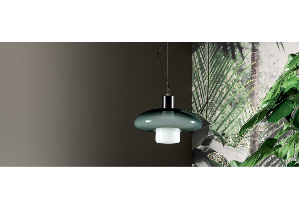 Acquerelli Double, von Marco Zito für Bonaldo entworfen, ist eine Pendelleuchte mit bleifarbener Metallstruktur und Lampenschirm aus Glas in verschiedenen Farben. Der Lampenschirm besteht aus zwei Glasstücken.