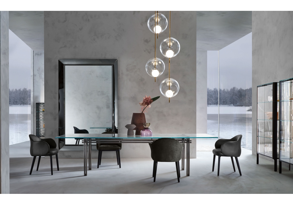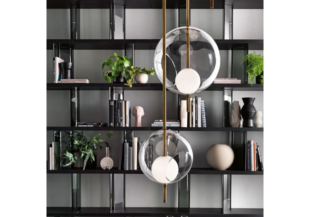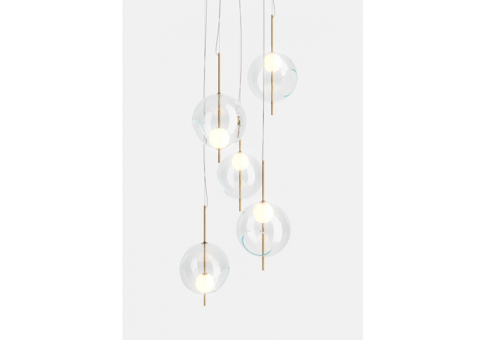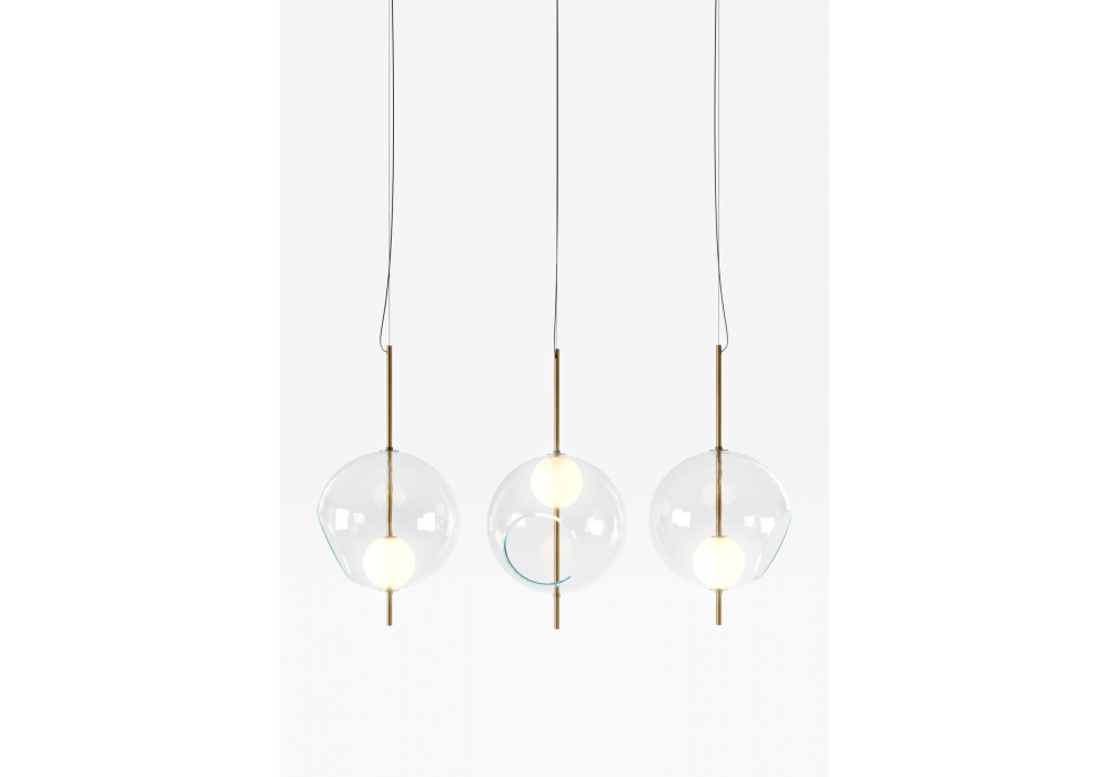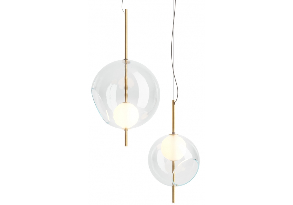 Pearl von Adele Martelli für Fiam entworfen, ist eine LED-Pendelleuchte mit einer Metallstruktur in brüniertem Messingfinish. Die äußere Kugel besteht aus transparentem, mundgeblasenem Muranoglas, während die innere, die als Diffusor dient, aus opalweißem, mundgeblasenem Glas besteht.