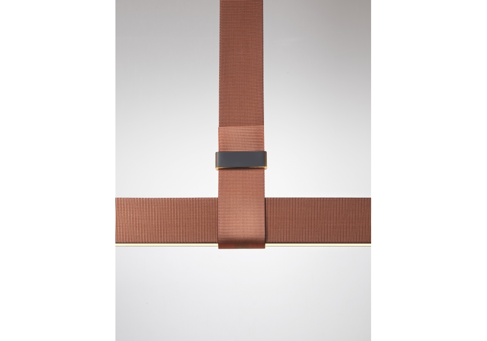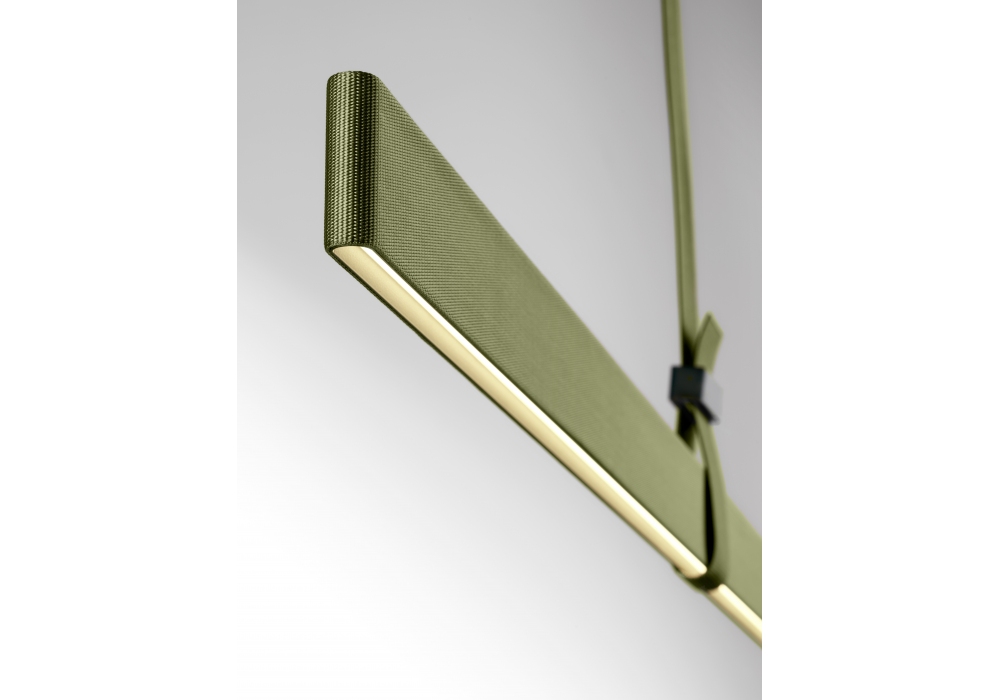 Belt Fabric von Ronan & Erwan Bouroullec für Flos entworfen, ist eine Hängeleuchte mit einer stoffbezogenen Struktur aus extrudiertem Aluminium und einem Diffusor aus opalfarbenem Polycarbonat. Integrierter Schalter (fernbedienbar). LED-Lichtquelle inklusive.