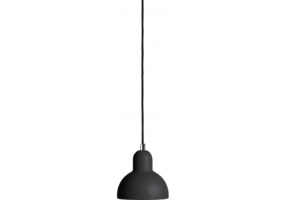 Kaiser Idell von Christian Dell Fritz Hansen entworfen, ist eine Hängeleuchte mit silbernem Baldachin und Diffusor in mehreren Ausführungen. Schwarzes Textilkabel.