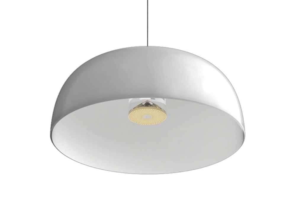 Tia Mono von Foster + Partner für Lumina entworfen, ist eine Hängeleuchte mit rundem Baldachin und Aufhängungskabel mit Textilfaser ummantelt. Der Lampenschirm ist rund aus weißem mundgeblasenem Glas und nimmt eine dimmbare LED-Lichtquelle in verschiedenen Versionen auf.