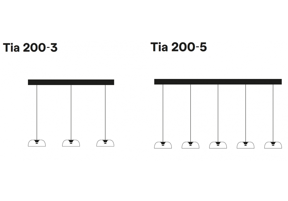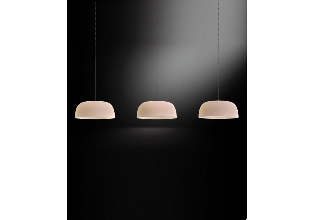 Tia Linear, von Foster + Partner für Lumina entworfen, ist eine Pendelleuchte mit viereckigem Baldachin aus Metall und mit Textilfaser ummantelten Aufhängungskabeln. Die Diffusoren sind kreisförmig aus weißem mundgeblasenem Glas und nehmen eine dimmbare LED-Lichtquelle in verschiedenen Versionen und Lichtschattierungen auf. Tia Linear ist in verschiedenen Modellen erhältlich.
