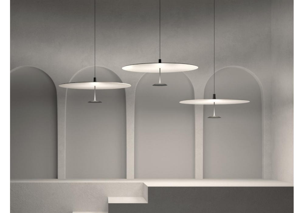 Dot 600 Linear von Foster + Partner für Lumina entworfen, ist eine Hängeleuchte mit viereckigem Baldachin aus Metall und mit Kunststoff überzogenen Aufhängungskabeln. Die Diffusoren sind durch zwei parallele Scheiben strukturiert, die von einem halbglänzenden schwarzen oder ultramatten weißen Metallstab zusammengehalten werden. Die Lichtquelle ist eine integrierte LED dimmbar in verschiedenen Lichtschattierungen. Dot 600 ist in verschiedenen Kabellängen erhältlich.