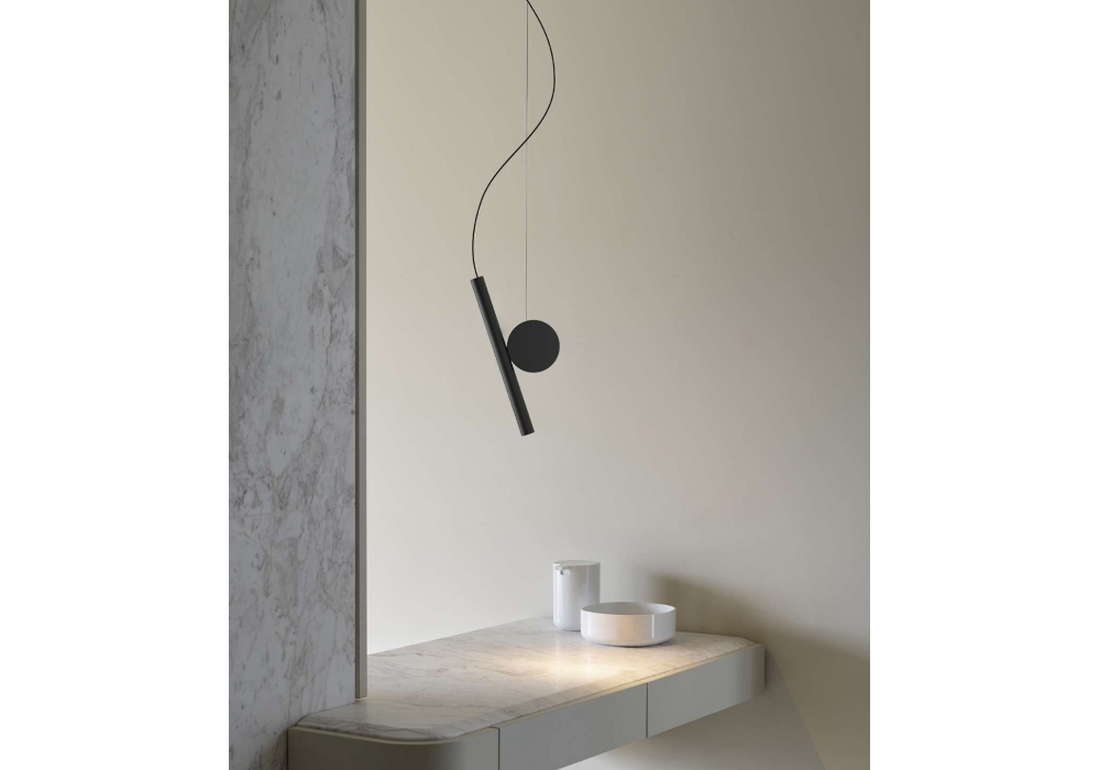Doi von Meneghello Paolelli für Luceplan entworfen, ist eine Hängeleuchte mit Zylinder aus schwarz, messingfarbenem oder weiß gestreiftem Aluminium mit Gegengewicht aus Eisen in verschiedenen Ausführungen. Sie können zwischen DALI-Dimmer oder Phasenabschnitt wählen. Gegengewichtszubehör erhältlich.