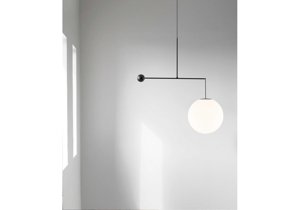 Malamata von Shulab für Luceplan entworfen, ist eine Hängeleuchte mit Struktur aus mattschwarzem Stahl oder gebürstetem Messing und opalweißem Diffusor aus mundgeblasenem Glas. Das Licht kann dank eines Kugelgegengewichts eingestellt werden. Durch Drücken des Knopfes darüber wird eine Feder freigegeben und das Gegengewicht kann frei auf dem Arm gleiten.