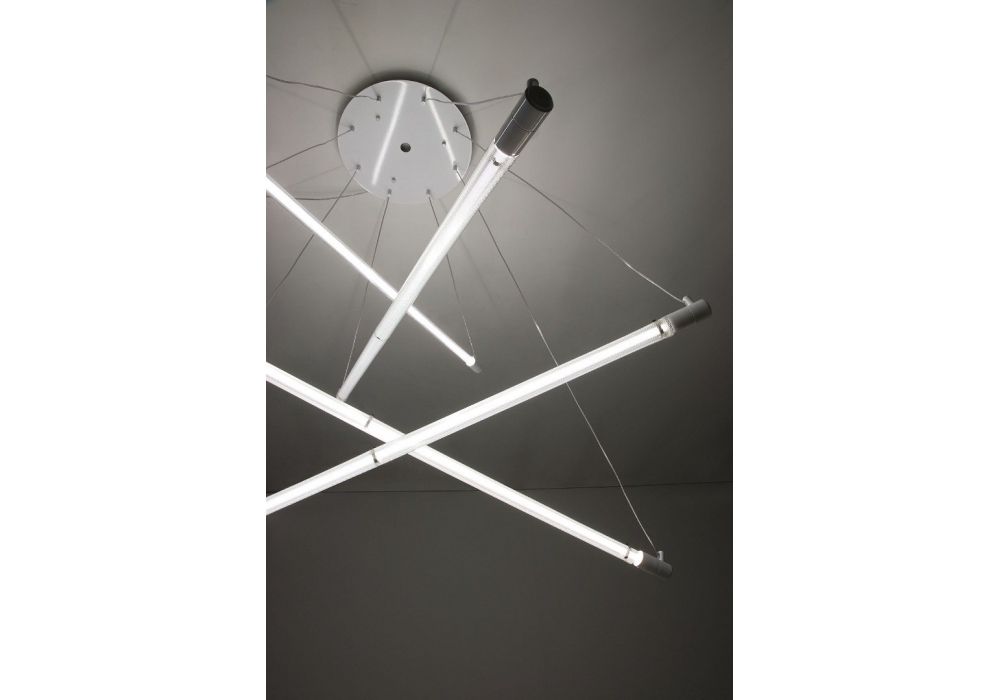 Shanghai von Studio Lucchi & Biserni, Angelo Micheli für Martinelli Luce entworfen, ist eine Hängeleuchte mit tragender Struktur aus Aluminium und lackiertem Metall. Die vier Diffusoren bestehen aus transparentem röhrenförmigem Polycarbonat und schirmen eine LED-Lichtquelle ab.