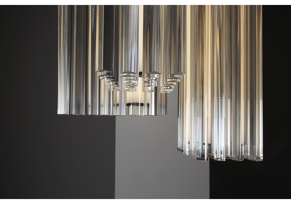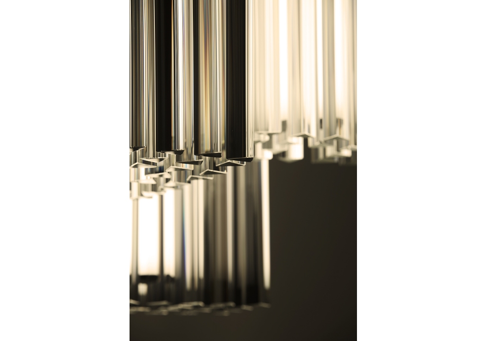 Grace von Massimo Tonetto für Venicem entworfen, ist eine Pendelleuchte mit diffusem Licht. Mattschwarze Metallstruktur mit Stahlkabeln, bestehend aus dreieckigen Kristalltriedern. LED-Streifen im zentralen zylindrischen Körper. Dimmer-Kit und Deckenrosette separat erhältlich.
