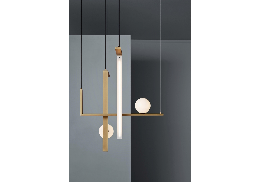 Less System von Massimo Tonetto für Venicem entworfen, ist eine Hängeleuchte mit diffusem Licht. Struktur aus natürlichem brüniertem Messing, glänzendem schwarzem Nickel oder mattem schwarzem Nickel, bestehend aus Messingprofilen, Kugeln und Diffusoren aus satiniertem Glas. Selbsttragende Seile aus schwarzem Gewebe und Stahlseilen mit Schnellbefestigungssystem. Erhältlich in verschiedenen Zusammensetzungen und Größen.